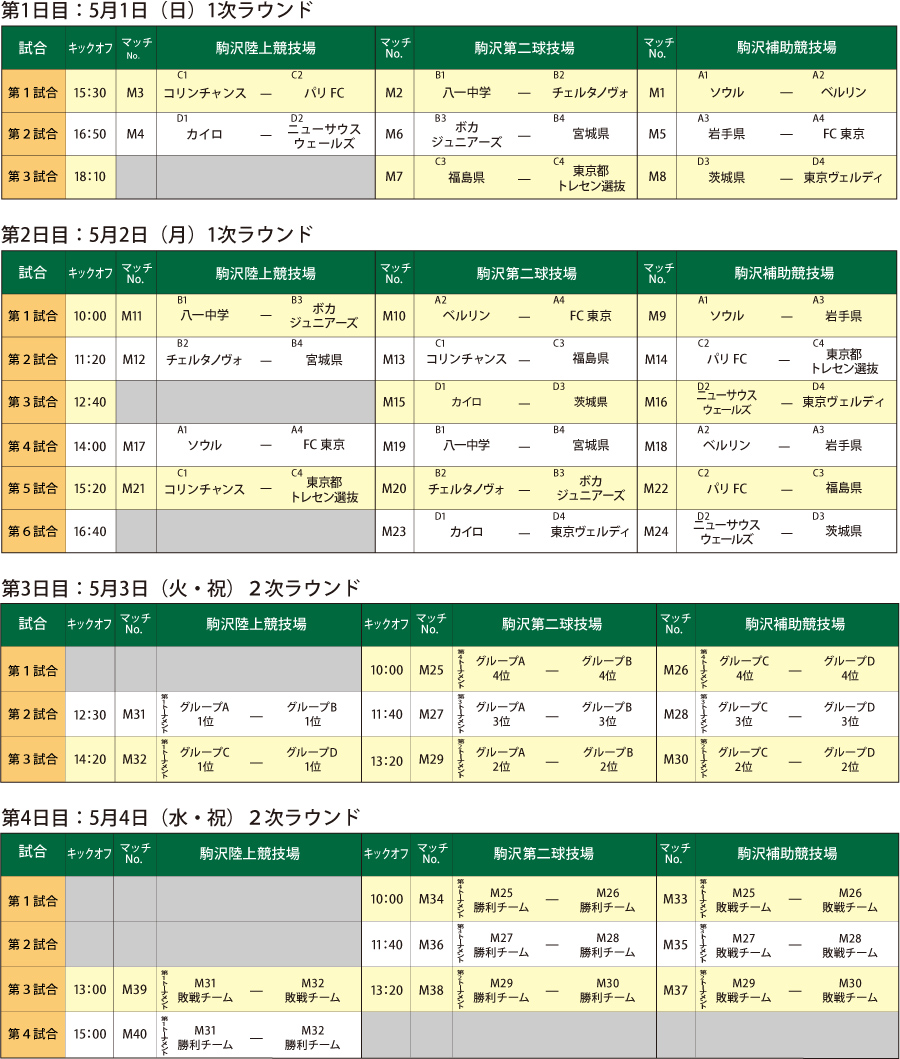 1. 1次ラウンド40分(20分ハーフ)とし、ハーフタイムのインターバルは5分とする。時間内に同点の場合は、引分けとする。